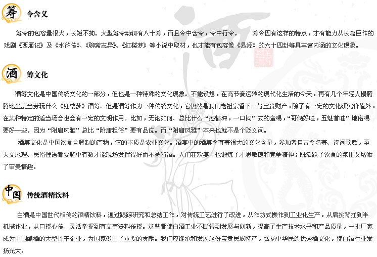 | “杯小乾坤大,壺中日月長”,無論怎樣,人在社會生活中都要直接或間接地與酒搭上關(guān)系。這種關(guān)系的物化表現(xiàn)就是酒趣。酒趣富于酒令之中,酒令則純是以文化入酒的,是酒文化中的文化精粹。 早在兩千多年前的春秋戰(zhàn)國時代,酒令就在黃河流域的宴席上出現(xiàn)了。酒令分俗令和雅令。猜拳是俗令的代表,雅令即文字令,通常是在具有較豐富文化知識的人士間流行。白居易曰:“閑徵雅令窮經(jīng)吏,醉聽新吟勝管弦?!闭J(rèn)為酒宴中的雅令要比樂曲佐酒更有意趣。文字令又包括字詞令、謎語令、籌令等。 |